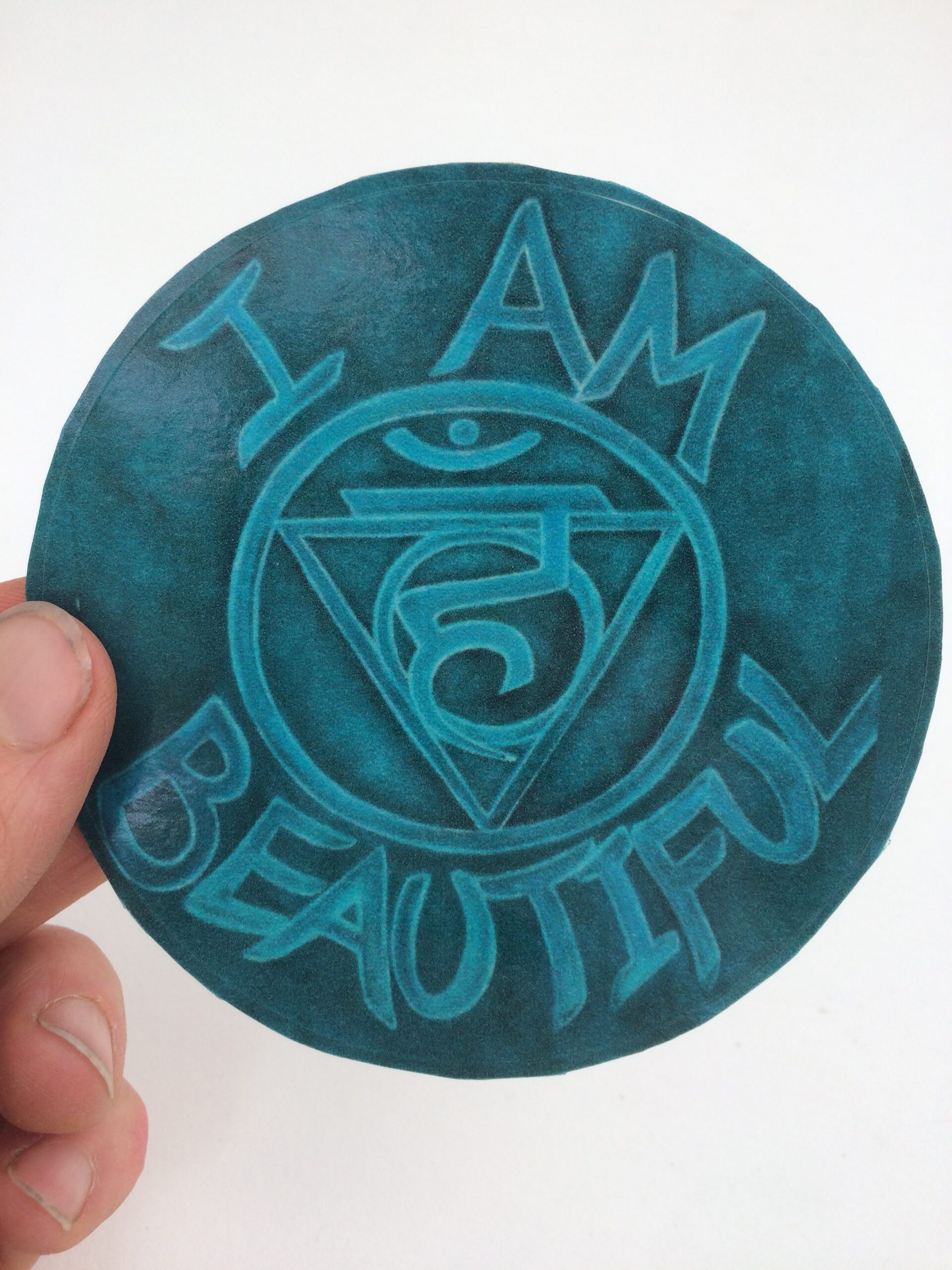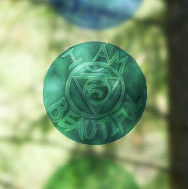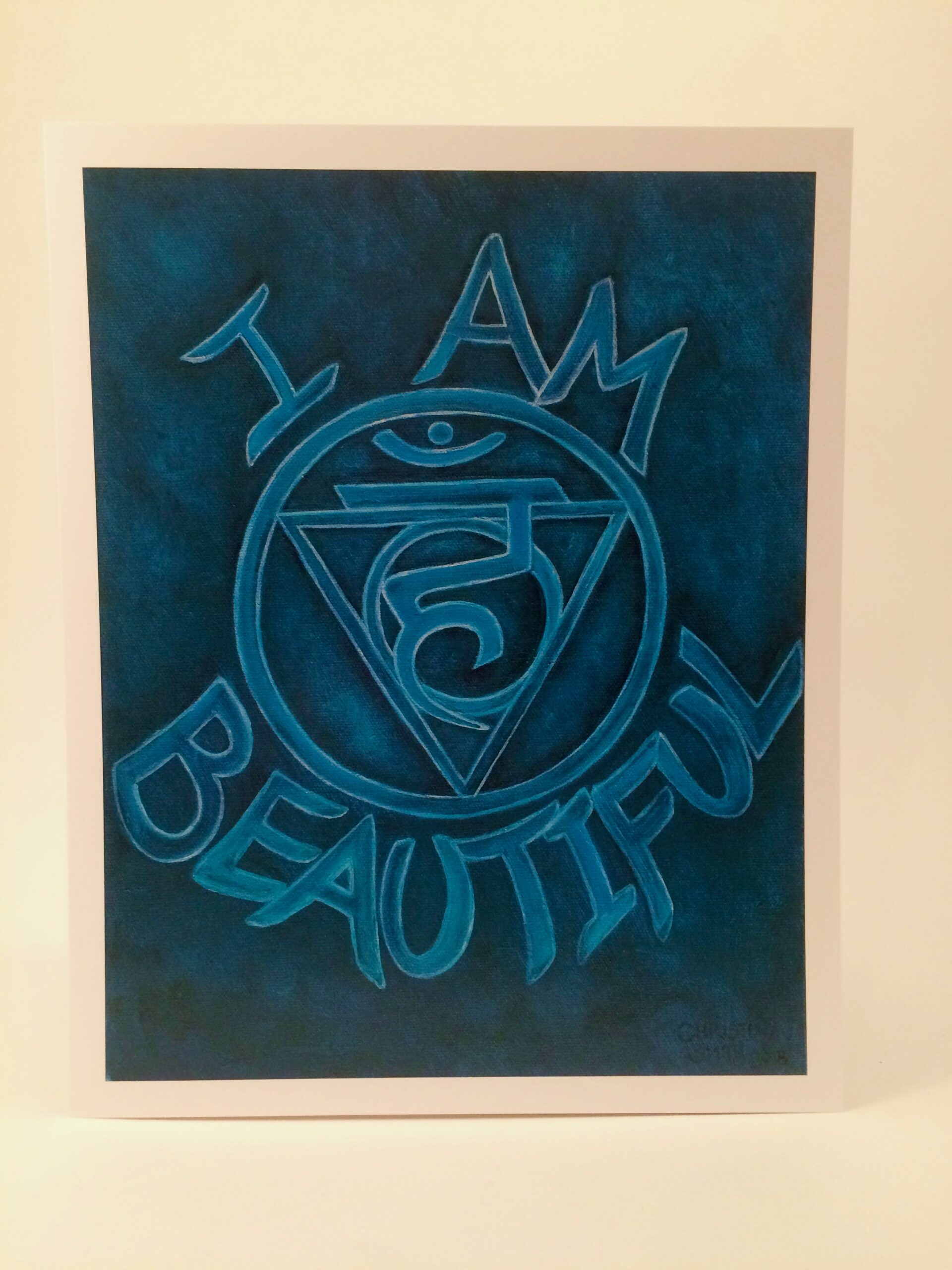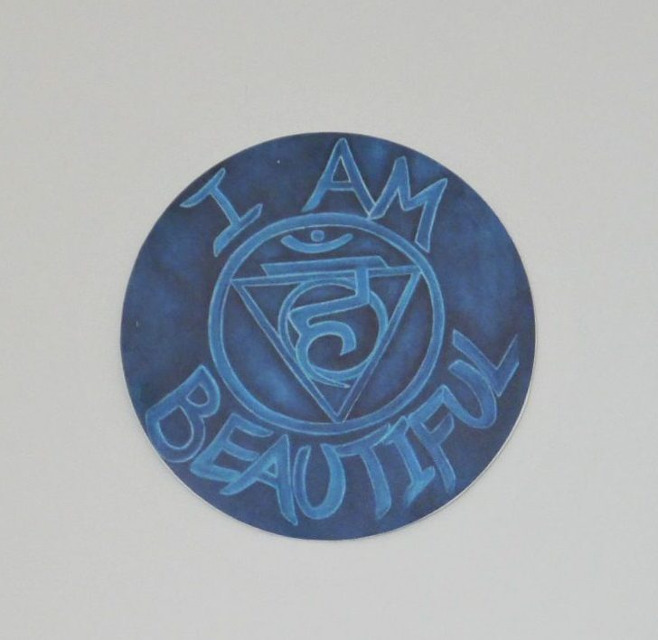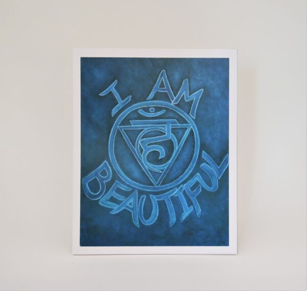 From a chakra series of oil paintings called ‘Mantras for Manifesting’ themed around the essence of each chakra as it relates to manifesting a beautiful, abundant life. ‘I Am Beautiful’ is the 5th chakra design, the throat, Vishuddha, meaning purification.