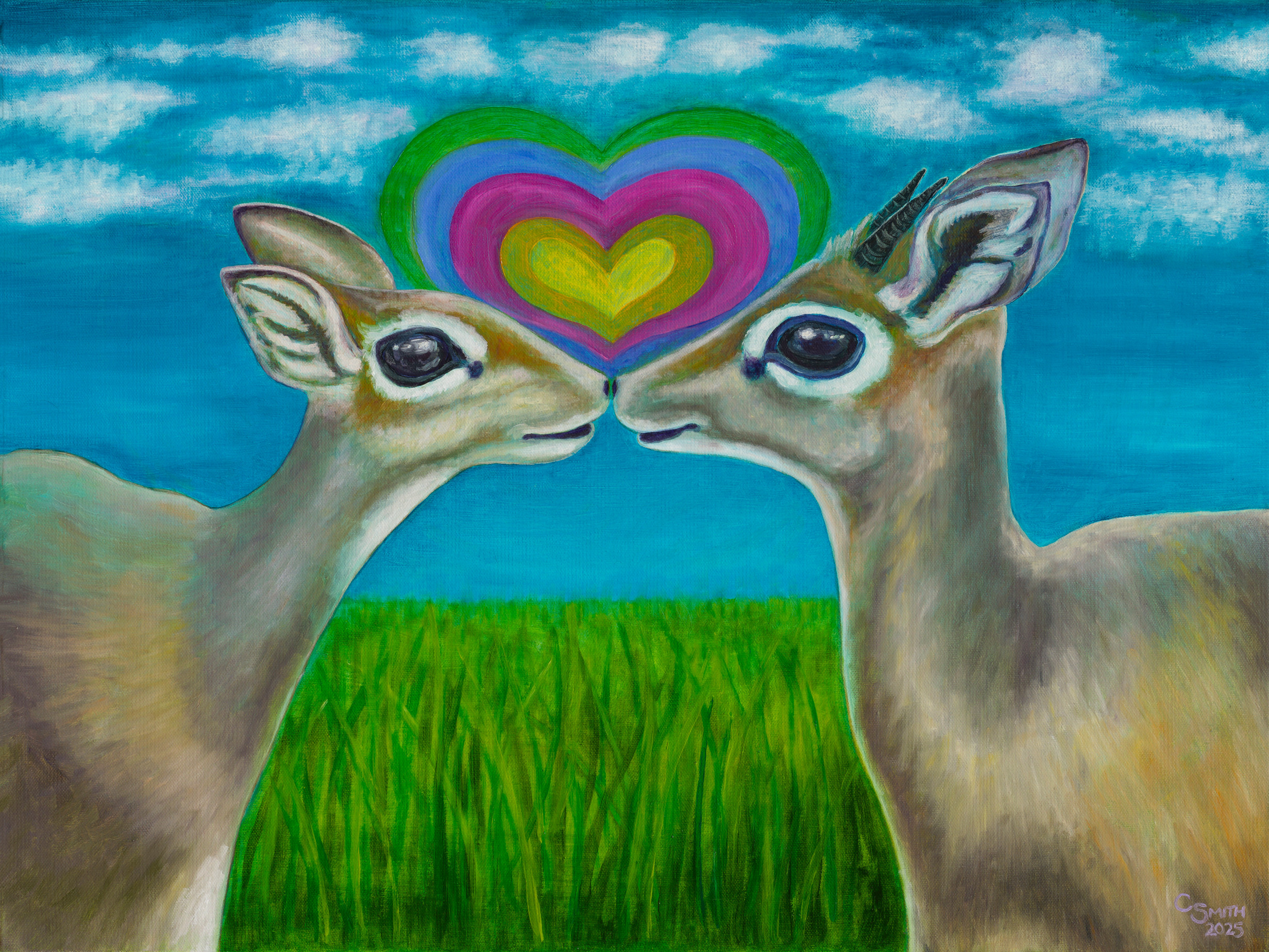The original water mixable oil on canvas painting is 18″x 24″ created in 2025. This image of the dikdiks is available as a card or 8″x 10″ print.